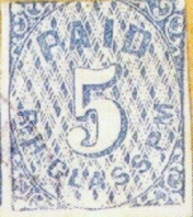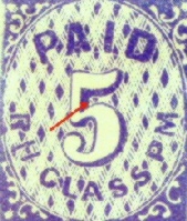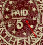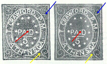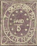 The genuine Athens, Ga Provisional Stamps are scarce with a high catalog value. The fakes are not seen very often but can be easily spotted. The Athens Postmaster, Thomas Crawford, issued a provisional stamp in a 5c denomination only. There were no 10c Athens Provisionals issued. Any Athens Provisional stamps in a 10c denomination are FAKES. The genuine Athens stamp was issued in two types and in two colors -- purple and red. The difference between the two types can best be seen in the scroll work particularly at the upper right corner. The purple stamp is the one that is usually seen and exists in a variety of purple shades. The red stamp is extremely scarce. Illustrated below is a genuine purple Athens, Ga 5c Provisional Type I. Note the white bar between "PAID" and "5." In the vast majority of the fake 5c Athens Provisional Stamps that are seen, this white bar is absent.