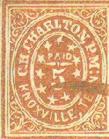 The Nashville Postmaster, William McNish, also prepared provisional stamps in the 3c USA rate. The 3c Nashville Provisional was printed but never issued and never used. It was a relatively simple stamp and widely reproduced. Genuine ones are scarce while fakes are somewhat plentiful. Illustrated below are the genuine and the fake 3c Nashville Provisionals. Note the thick outer red frame. In the original, there are various breaks in this frame with the two most prominent being at the left center and the right center. The fake is usually somewhat off-color, a little more crudely printed, and the thick red outer frame is solid and has no breaks. To futher muddy the waters, there are examples of the genuine stamp with a fake Nashville postmark. Since these stamps were never issued and never used, there are no legitimately used examples.