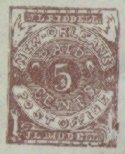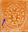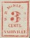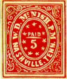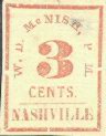 Nashville, Tenn issued 5c and 10c Provisionals. The 5c Nashville is seen somewhat frequently as provisionals go, but the 10c Nashville is quite scarce. The fakes of the 5c Nashville are particularly well executed and can very easily be mistaken for the genuine stamp. The genuine 5c Nashville exists in various shades of red and can also be found in a violet brown and a gray. The reproductions are also found in these same colors. Below are illustrated the two major fakes along with the genuine stamp in red.