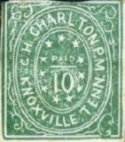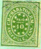Knoxville was also known to have issued a 10c Provisional Stamp in Green with the same design as the 5c. At the current time, there is only one known recorded genuine example of the 10c Green Knoxville Provisional, and it is on a cover. It is considered to be a unique item. But there are reproductions of this stamp available in the green color. The genuine Knoxville 10c Provisional cover was sold in the 1997 Siegels Rarities of the World Auction. The illustration of the genuine stamp below is cropped from the full cover illustration that appears in the 1997 Siegel Rarities Catalog. Again, like the 5c Knoxville Provisional, the genuine 10c stamp shows detailed printing and very elaborate ornamentation at the four corners. The fakes are more crudely printed and show scant and incomplete scrollwork in the corners. Also the "1" on the reprint is upside down and backwards. Any 10c Knoxville Provisional Stamp that the average collector may run across will almost assuredly be a reproduction. But there may be other genuine ones just waiting to be discovered.