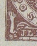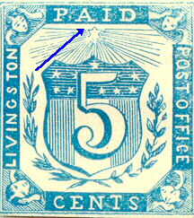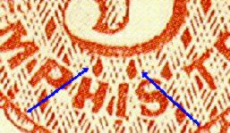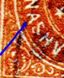 The rare genuine stamp is on the left. The one on the right is the common fake. There are many differences between the two which are obvious when the stamps are side by side. But the most obvious difference that can be seen in a stand alone fake stamp is the white space (absence of rays) between the 6-pointed star at the top center and the inner frame (blue arrow). The genuine stamp has the whole area filled with rays. Also note the figures in the four corners. On the genuine stamp, these figures are well executed and quit detailed. Whereas on the fake, the figures are not nearly so well done and look almost crude compared to the original.