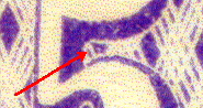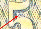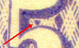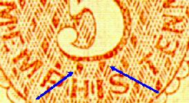 There are numerous small differences between the fakes and the genuine. But the quickest way to tell the difference between a fake and a genuine is to use a magnifier and check the background between the top loop and the cap of the "5" (see below red arrows). In the genuine, there is a distinct well-formed paralellogram while in the various fakes this geometric figure is either trapezoidal or triangular. Also examine the ornamentation in the four corners. The corner ornamentation is more elaborate and more detailed on the original than on the fakes.