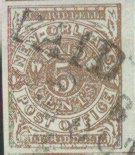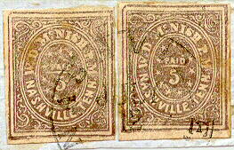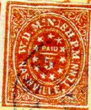 Just because the provisional stamps appear to be genuinely used is no gaurantee that they are genuine. Below are illustrated two Taylor 5c Nashville Fake Reproductions in brown affixed to a small piece and cancelled with what appears to be a genuine Nashville postmark. On close inspection, it is obvious that these stamps are the Taylor Reproductions (look at the pattern of the ornamentation in the four corners). The Nashvile postmark while closely resembling the genuine postmark has differences in the lettering style, size, and spacing. This is in fact a well known fake Nashville postmark that is also sometimes seen on the 3c McNish Provisional (see below).