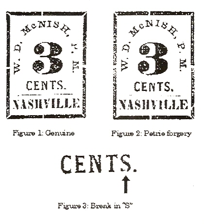 But just looking for a broken frame vs a solid frame in the 3c Red Nashville Provisional is not enough. The presence of the solid frame immediately and unmistakenly identifies the stamp as a fake. But in 2005, another very dangerous forgery of this provisional was described in the Oct - Dec 2005 issue of the Confederate Philatelist. This forgery is attributed to the infamous 19th Century philatelic forger James A. Petrie. The illustration below is taken from the cited article. The Petrie forgery does indeed have breaks in the outer frame similar to the genuine, but the easiest way to identify this forgery is to look at the "S" of "CENTS." In the genuine, the bottom loop of the "S" has a constant easily identified break. The Petrie forgery has a complete "S" with no break. There are other subtle differences in the typeface and settings and alignments, but the difference in the "S" is the characteristic most easily seen.