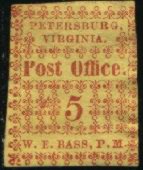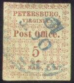 There is an excellent fake of the 5c red Petersburg, Va in existence. This fake is almost indistinguishable from the genuine stamp. One of the differences is in the appearance of the numeral "5." Compare the "5's" in the genuine and the fake stamp below. The "5" in the fake stamp on the right is italicized. But an easier way to tell the difference is to look at "PETERSBURG" and "VIRGINIA." In the fake, the lettering of both words is the same size. In the genuine, "PETERSBURG" is about 30% larger than "VIRGINIA."
