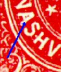 The genuine stamp is on the LEFT (Type II) with the newly discovered Type II fake on the RIGHT. This fake has the white bar. Note that the white bar is horizontal in the genuine stamp but droops downward at the right on the fake stamp. On closer examination, there are numerous small differences between the two such as differences in the lettering, the drooping white bar and the smaller stars found on the fake, and the overall much coarser appearance of the genuine when compared to the smoothness of the fake. The arrows above illustrate three main differences which can quickly distinguish the Type II genuine from the fake.