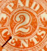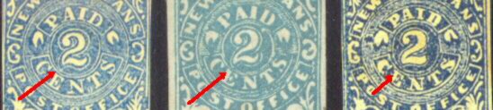 The genuine stamp is the one in the middle. The stamp on the right is a Taylor Reproduction, and the one on the left is an Upham Reproduction. There should be no problem in identifying the fake on the right because of its cruder printing quality and darker blue color. But the reproduction on the left is very deceptive. It is easy to see the difference in printing quality when the stamps are side by side, but it can be very difficult when the stamps stand alone. The key to identifying the reproductions from the genuine 2c Blue New Orleans is to look at the position of the central "2" in relation to the circular frame around the "2." As seen in the illustration below, the lower left point of the "2" in the genuine (center) stamp actually breaks the circular frame line. Whereas in the reproductions, the circular frame line is entirely intact with no break. Incidentally, the 2c New Orleans Provisional is scarce in used condition. The majority of the ones still in existence are unused.