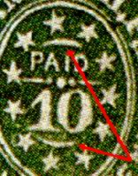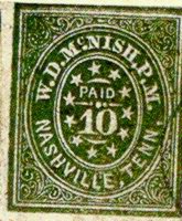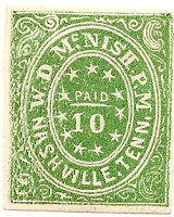 The genuine 10c Nashville Provisional is an extremely scarce item and is listed only in green. It has the same general design as the 5c Nashville. Below is illustrated a genuine 10c Nashville Provisional and the crude reproduction. Notice in the genuine stamp that there are curved ornaments above the word "PAID" and below the numeral "10." In the reproductions, these curved lines are missing.