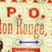 The defining characteristic in distinguishing the genuine from the fake 5c Baton Rouge has to do with the circles in the background pattern. Using a magnifier, measure the horizontal distance between the center of the adjacent circles. In the genuine stamp, the distance measures out to 4.5mm; while the fake measures only 3.75mm. This is tough to do on a photo or a scan and can only really be accurately done on the stamp itself.