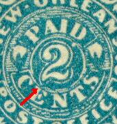 The 2c Blue New Orleans was actually the second printing and was issued on 3 July 1861. The first printing was in Red (Scott #62x2). A genuine 2c red New Orleans is illustrated below. But the 2c red was put aside and was not made available to the public until early 1862 not long before the fall of the city. The printing characteristics of the genuine vs fake 2c red and the 2c blue stamps are exactly the same. Look for the position of the "2" and the break in the circular frame.