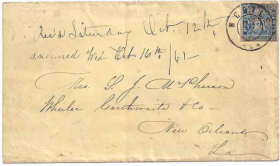 | AL534 | CSA #58x2 Mobile 5c Blue Provisional (4-Margin with just a little minor toning) tied by the small double circle Mobile, Ala CDS 10 OCT 1861. Addressed to Mrs. S. J. McPherson, Wheeler Garthwaite & Co, New Orleans, La. Complete cover with a minor reduction at the left not affecting anything and period receiving docketing on the face of the cover. | $1,000.00 |