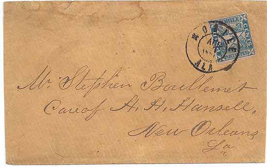 AL535 | CSA #58x2 Mobile 5c Blue Provisional (4-Margin but just a little close at the upper right) tied by the small double circle Mobile, Ala CDS 20 AUG 1861. Orange paper cover addressed to Mr. Stephen Boullement Care of A. H. Hansell, New Orleans, La. Part of backflap torn away, just a little light foxing, and a small sealed edge tear at the upper left. Cover with an overall very clean appearance and a very nice stamp. | $1,000.00 |