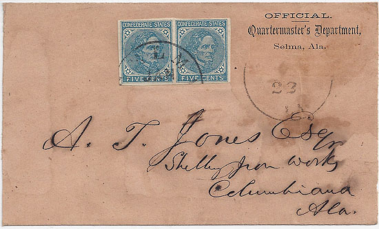 | AL555 | CSA #7 Horz Pair (4-Margin but close at the top right) tied by the Selma, Ala (1863) CDS 22 JAN. Semi-Official Imprinted Cover "OFFICIAL. Quartermaster's Department, Selma, Ala." (Type WD-QM-14). The stamps were originally affixed over the imprint but have been lifted and hinged to the left in order to display the imprint. Addressed to A. T. Jones Esqr, Shelby Iron Works, Columbiana, Ala. Cover with a little light staining at the right, but otherwise Very Fine. Ex-Wulfekuhler. | $350.00 |