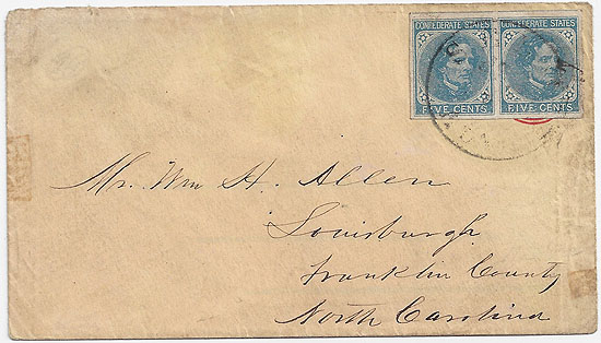 AL560 | CSA #7 Horz Pair (4-Margin) affixed over the embossing of a USA Star Die (Adversity Cover) with the red rim of the Star Die seen at the bottom of the right stamp. The stamps are tied by the usual somewhat weak but recognizable strike of the Selma, Ala CDS (date not fully apparent). Addressed to Mr. Wm H. Allen, Louisburg, Franklin County, North Carolina. Clean cover. Ex-Bogg. | $250.00 |
