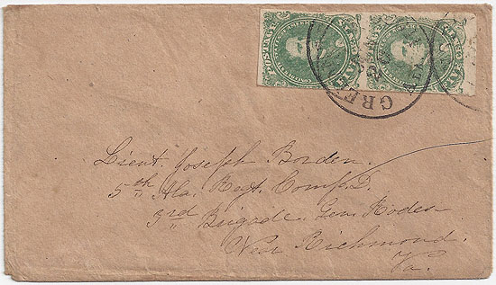 CSA #1 Vert Pair affixed sideways Stone 2 Positions 33, 43 (margin touches at the left) tied by three partial strikes of the Greensborough, Ala CDS 20 JUN (1862). Light brown cover with Military Address to Lieut Joseph Borden, 5th Ala Regt Comp D, 3rd Brigade Gen Rodes near Richmond, Va.
