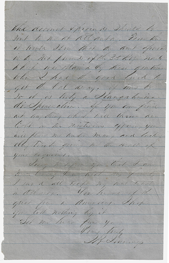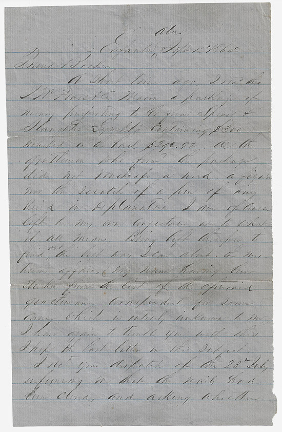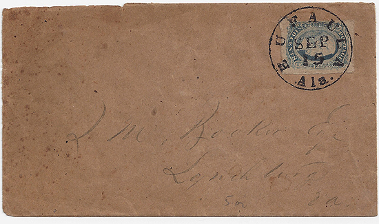 | AL566 | CSA #11 (AD) affixed sideways (margin a little irregular at the left) tied by a full bold strike of the Eufala, Ala CDS 15 SEP (1864). Coarse brown paper cover addressed to J. M. Booker Esq, Lynchburg, Va. The original letter is with the cover but is difficult to read and appears to be business related. Clean cover signed "Dietz" on the back. | $100.00 |