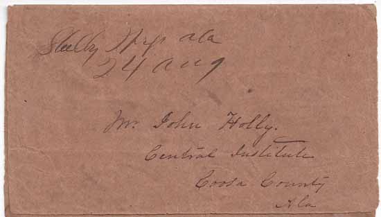 Holly, Central Institute, Coosa County, Ala. Coarse brown paper adversity cover which is undoubtedly homemade. Second Use (outside) CSA #11 (AD) (4-Margin affixed upside down) tied by full strike of the Central Institute, Ala balloon