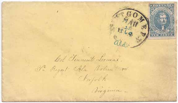 paper cover with Military Address to Col Tennent Lomax, 3rd Regmt Ala Volunteers, Norfolk, Virginia. Very clean appearing cover and a Very Fine stamp.