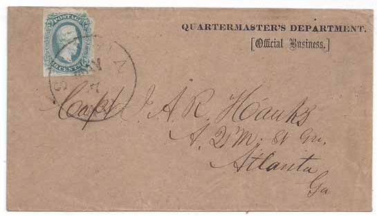 | AL610 | CSA #11 AD (margins a bit irregular with a clip at the upper right corner) tied by the Selma, Ala CDS. Coarse brown paper cover with a Semi-Official Imprint "QUARTERMASTER"S DEPARTMENT. [Official Business.]" This imprint is not currently listed in the CSA Catalog. Military Address to Capt J. A. R. Hanks, A Q M St Ga (Assistant Quartermaster State of Georgia), Atlanta, Ga. CSA Certificate 2002 "Genuine" but must have just been inadvertently overlooked for the catalog. Very Fine. | $450.00 |
