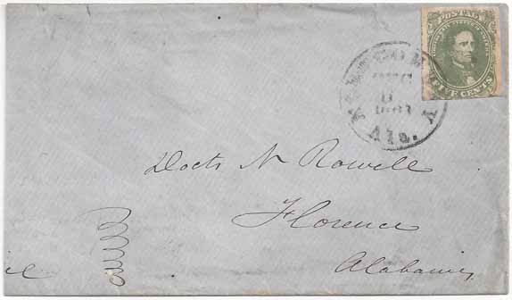 AL615 | CSA #1 Stone 1 (not plated) (margin in at the bottom) tied by the Montgomery, Ala CDS 6 DEC 1861. Blue paper cover addressed to Doct N. Rowell, Florence, Alabama. Clean cover reduced at left and part of left side back flap missing. | $150.00 |