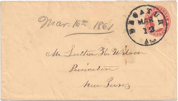| AL636 | USA Star Die with Patent Lines with a very bold strike of the Decatur, Ala CDS 12 MAR (1861) USA Used in CSA Alabama to Union New Jersey. Addressed to Mr. Luther H. Wilson, Princeton New Jersey. Period receiving docketing at top center "Mar 16th 1861.'" Back flap opening tears but otherwise a Very Fine appearance. Ex-Koppersmith Collection and believed to be 1 of only 2 recorded USA Used in CSA Alabama uses from Decatur. Both covers are from the same correspondence. | $450.00 |
