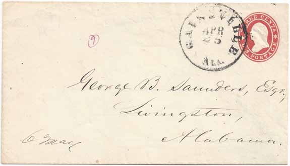 AL637 | USA Star Die with Patent Lines and the Gainsville, Ala CDS 25 APR (1861) USA Used in CSA Alabama. Addressed to George B. Saunders Esqr, Livingston, Alabama. Part of back flap missing. Very clean cover. Ex-Koppersmith Collection. | $250.00 |