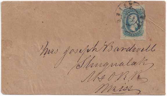 | AL649 | CSA #11 (AD) (4-Margin) overheated plate (CC 11-AD-v7) tied by the small double circle Mobile, Ala CDS 17 MAY 1864. Coarse brown paper cover, possibly homemade, with railroad address to Mrs. Joseph Bardwell, Shuqualak, M & O RR (Mobile and Ohio Railroad), Miss. Very light diagonal corner crease at the upper right through the top right of the stamp, otherwise Very Fine. | $175.00 |