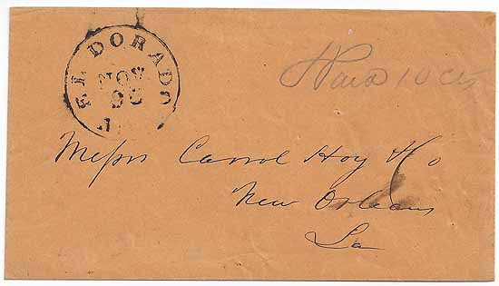 AR82 | “Paid 10cts” in manuscript with the El Dorado, Ark CDS 26 NOV (1861) (day logos inverted). Orange paper cover from the Carroll, Hoy & Co New Orleans Correspondence. Scarce Arkansas use from Union County. Very Fine Ex-Agre. | $550.00 |