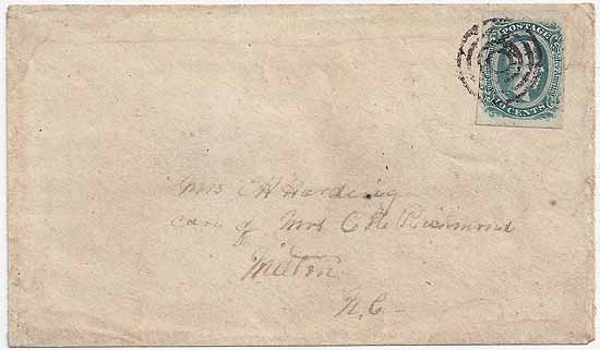 | AF173 | CSA #11c (AD) (4-Margin Greenish-Blue) tied by the Army of Northern Virginia Field Target Cancel. Addressed to Mrs.E. H. Harding Care of Mrs. C. R. Richmond, Milton NC. The cover was sent by Ephraim H. Harding who was the Chaplain of the 45th NC Inf to his wife. Very Fine. | $150.00 |