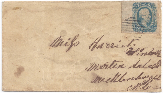 | AF236 | CSA #12 (AD) (4-Margin with a l;arge left sheet margin) tied by the Army of Northern Virginia unfamed 10-Bar Field Grid Cancel Type ANV-11 used 1864-1865 without a postmark. Addressed to Miss Harriet McIntosh, Martindale PO, Mecklenburg Co. NC. Most likely sent by a North Carolina soldier home to a girl friend or relative. Very clean cover with a very nice stamp. | $125.00 |