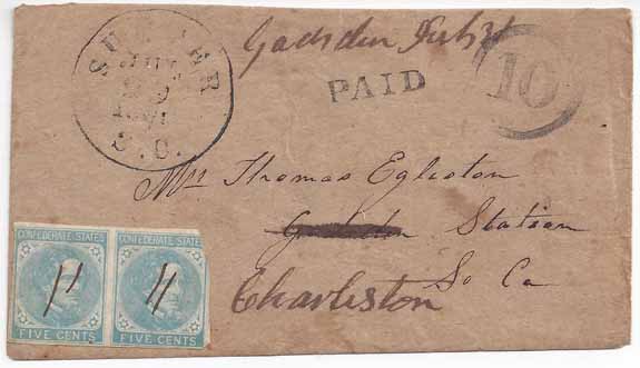 Charleston with Gadsden lined through and affixing a pair of CSA #6 stamps