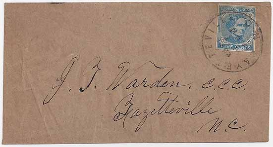 | HB14 | CSA #7 Single (4-Margin but a little close at the upper right) tied by the Fayetteville NC CDS 19 MAY 1863. Coarse brown paper cover addressed to J. T. Warden C. C. C. (Clerk of the County Court), Fayetteville NC. Overpaid Drop Letter. Few back flap opening tears, otherwise Very Fine. Ex-Zimmerman. | $300.00 SOLD |