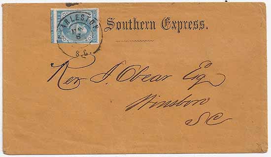 | HB25 | CSA #6 Single Use Prior to the Rate Change (margin close at the bottom right corner but a significant part of the stamp below is visible) tied by the small double circle Charleston SC CDS 8 MAY (1862) (early use). "Southern Express" imprinted advertising cover addressed to Rev J. Obear Esqr, Winnsboro SC. The addressee, Rev Josiah Obear (1810-1882), was an Episcopal minister in Winnsboro since 1841. Very Fine. Ex-Bogg, Ex-Alex Hall. | $400.00 SOLD |