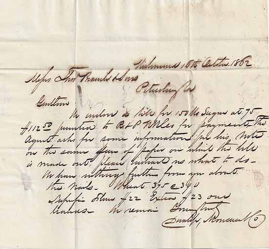 | HB32 | CSA #2b H&L Dark Blue (4 Large Margins) tied by the Richmond, Va CDS Powell Type 3g (broken "O" of "OCT") 17 OCT 1862. Folded Letter Complete addressed to Messers Thos Branch & Son, Petersburg, Va. Thomas Branch & Son was a well known Grocer and Commission Merchant business in Petersburg. The short one page business letter deals with payment of a business transaction. Very Fine. | $400.00 SOLD |