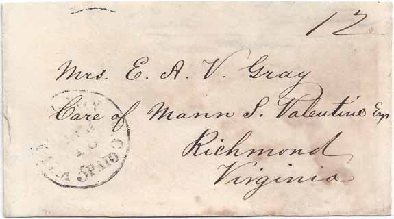 Mrs. E. A. V. Gray Care of Mann S. Valentine Esqr, Richmond, Virginia. Wilmington NC 5 PAID Integral CDS 16 APR (1864) and manuscript "12"