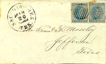 | CB19 | CSA #7 Horz Pair (4-Margin) canceled by two strikes of a framed Grid with the matching Nacogdoches, Tex CDS to the left 20 MAR. Addressed to Mr. Sam F. Mosely, Jefferson, Texas. This is a FRONT ONLY which is part of a folded letter. Cover originally included in the exhibit to show the Texas grid cancelation. This cover was used as an illustration on Page 51 of Gen Bush’s Fancy and Unusual Cancel book. | SOLD |