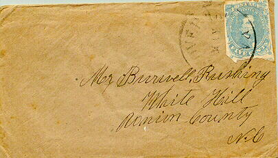 CB29 | CSA #4b Stone 2 Light Milky Blue (4-Margin but with pre affixing faults) tied by the Hanover CH, Va Large Balloon CDS with a MAY (1862) date. Coarse paper homemade adversity cover addressed to Mr. Burwell Rushing, White Hill Union County NC. Cover originally included in the exhibit to demonstrate the large balloon postmark canceling the stamp. This cover was used as an illustration on Page 71 of Gen Bush’s Fancy and Unusual Cancel book. | SOLD |