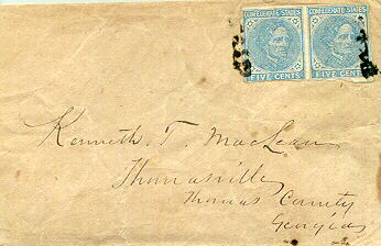 CB41 CSA #7 Vert Pair (margins close left and right and affixed sideways) tied by two strikes of a small PAID handstamp. Endorsement at upper left “J. S. Boynton Lt Col 30th Ga Regt” to Mrs. Fannie Boynton, Jackson Butts County, Georgia. The cover is undated and there is no postmark. Since there is a military endorsement from an Army of Tennessee unit, there is some speculation that this may be an army field cancel, but this has yet to be proven. Just a little light foxing but otherwise a Very Fine Appearance and most unusual. Cover originally included in the exhibit to show handstamp PAID used to cancel the stamps. SOLD