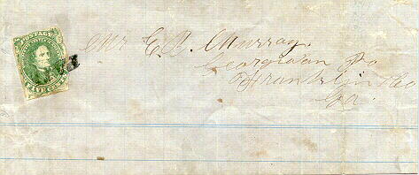 | CB47 | CSA #1 Stone 2 (irregular margins with a clipped right lower corner) tied by a PAID handstamp of unknown origin. Adversity cover made from a lined ledger page but part of the back is missing. Clean cover addressed to Mr. E. B. Murray, Georgian PO Franklin Co., Ga. Cover originally included in the exhibit to show this unusual cancellation. | SOLD |