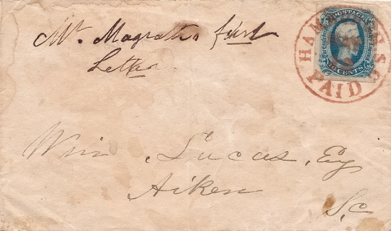 CDS 12 MAY. Addressed to Win Lucus Esq, Aiken SC. Minor edge water