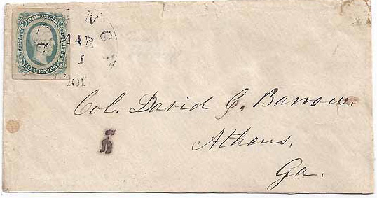 | FL164 | CSA #12d (AD) Greenish-Blue (4-Margin) tied by the Quincy, Flor CSA 1 MAR. Addressed to Col David C. Barrow, Athens, Ga. The addressee was a Georgia planter and plantation owner. The “Col” title was honorary and not associated with the Confederate Army. Cover with a little edge wear across the top and minor reductions right and bottom not affecting anything. Overall a very clean appearance with a nice stamp and Florida postmark. | $300.00 |