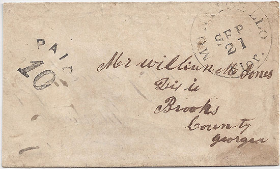 | FL191 | Turned Cover - First use (inside) Handcarried outside the postal system to Mr. James M. Troy, Monticello, Florida. Second use (outside) Monticello, Flor Handstamp PAID 10 Type C 21 SEP. Addressed to Mr. William M. Jones, Dixie, Brooks County, Georgia. Very clean cover. | $375.00 |