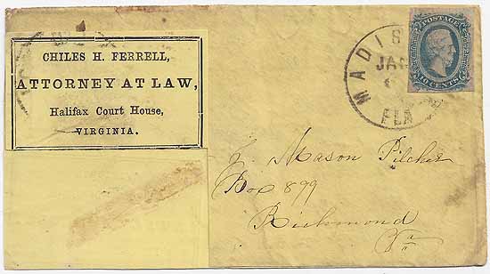CSA #11 (AD) (margin touches at left) tied by the Madison, Fla CDS 6 JAN. Addressed to Mr. J. Mason Pilcher, Box 899, Richmond, Va. Turned Cover