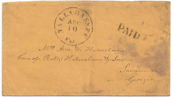 handstamp PAID 5(ms) 10 AUG (1861). This Tallahassee PAID 5(ms)