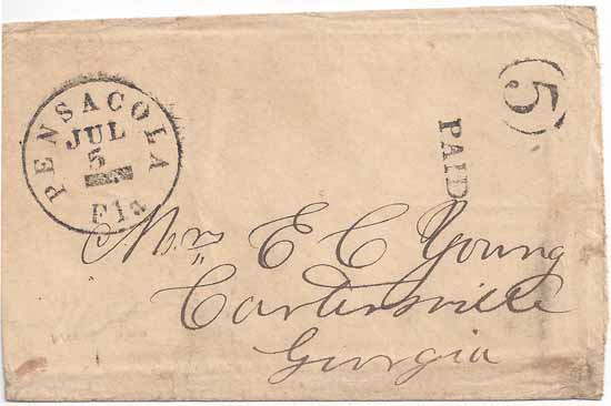 | FL219 | Stampless cover with the Pensacola, Fla CDS and handstamp PAID 5 Type F 5 JUL (1861). Addressed to Mrs. E. C. Young, Cartersville, Georgia. Cover with a little edge and corner wear and a little light foxing. Small reduction on the left. Thirty-one Type F covers in the Brigg's Census. | $150.00 |