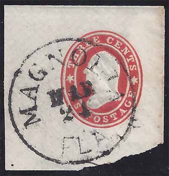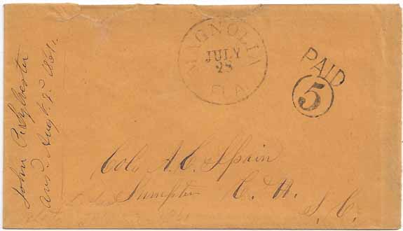 Magnolia, FLA, CDS dated 24 MAR (1861) USA Used in CSA Florida. Magnolia Mills, Florida, (Duval County) was located on the St Johns River 27 Miles south of Jacksonville and the site of a steam mill for processing lumber. The site was settled in 1790 under Spanish rule when a plantation named Hibernia was first established by George Fleming (1760-1821), an Irish immigrant under a Spanish land grant. After Florida Statehood, a US Post Office was established in 1853 with a name change from Hibernia to Magnolia Mills. The postmark on this cover is known from Magnolia Mills ("Mills" is omitted in the postmark) in the pre-war period with 10-20 covers estimated with the 3c USA rate during the pre-war years. Magnolia Mills is a US post office listed in the 1862 list of USA post offices. The pre-war US postmaster was Nathaniel D. Benedict (appointment dated 11/10/1853) who continued on as the CSA postmaster with his Confederate appointment dated 7/25/1861. The Confederate Magnolia Mills post office was short lived and was discontinued 11/8/1861 when the name was changed to Green Cove Springs and a new CSA postmaster was appointed. No Confederate covers are known with Green Cove Springs postal markings. After the war, the USPOD re-established the US post office 5/31/1866 and officially renamed it Green Cove Springs. Florida Postal Historians consider this Magnolia postmark on the presented cover to be a "Hotel Postmark" as the postmaster had his office in the Magnolia Hotel. Magnolia Mills is unlisted in the CSA Catalog. The cover here presented is a very important new find as until now there have been no recorded covers from the Magnolia Mills short time as a Confederate post office. This cover is now the only recorded cover from the Magnolia Mills, Florida, Confederate post office dated 3 days after PM Benedict's appointment as the Confederate postmaster. The cut square Star Die is the only known use from this post office in the USA used in the CSA period for Florida. There are no known uses from this post office during the Florida Independent State period. (Historial information courtesy of Deane Briggs MD, Florida Postal Historian.) Col Albertus Chambers Spain (1821-1881), an attorney and politician in Sumter SC, was a vereran of the Mexican War and served after the Mexican War in the SC state legislature. He was a delegate to the Convention of 1860 and a signer of the South Carolina Ordinance of Secession. After the Civil War, he lived in Darlington SC where he is buried. The title of "Col" was honorary. John P. Sylvester (1828-1912), the sender of the cover, entered service as a private in Co C 1st Fla Battn Cav 10/17/1861 and transferred to Co C 1st Fla Cav 1/1/1862. He was commissioned 2nd Lieut 8/4/1862. After the war, he lived in Kissimme, Fla, where he is buried. On the Federal Census of 1860, he is listed as a Lumber Merchant in Welaka. |