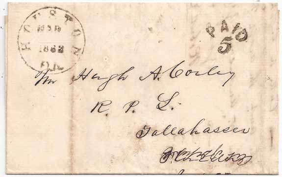 Stampless PAID cover with the Houston, Fla CDS with a MAR 1862 date and handstamp PAID 5