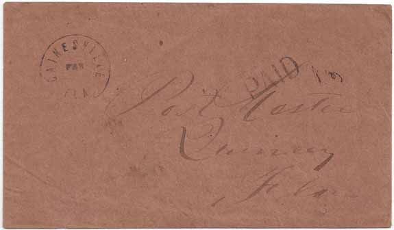 | FL272 | Stampless PAID cover with the small single rim Gainesville, FLA CDS with a FEB date and handstamp PAID 10 Type A 10 (ms). Very coarse brown paper cover which appears to be homemade addressed to Postmaster, Quincey, Fla. The Briggs' Census lists 9 covers from Gainesville of this type. Very Fine. | $350.00 |