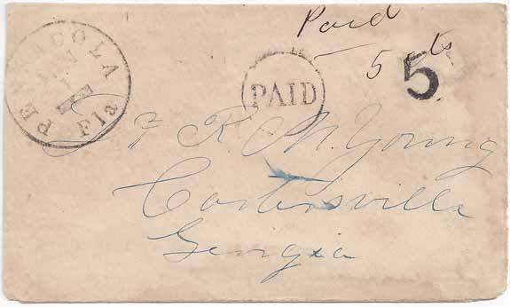 Stampless PAID cover with the Pensacola, Fla CDS 1 JUN (1861) (First Day of the Confederate Postal Service) and handstamp PAID 5 Type D over a mansucript "Paid 5cts."Addressed