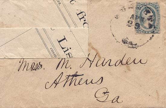 GA1001 | CSA #11 (AD) (margins tight on all four sides) tied by the single rim Augusta, Ga CDS 29 APR. Adversity Cover made from an unused printed freight listing document. Addressed to Mrs. M. Harden, Athens, Ga. Cover reduced at left not affecting anything, otherwise very clean and displayed flapped down from the upper left. | $350.00 |